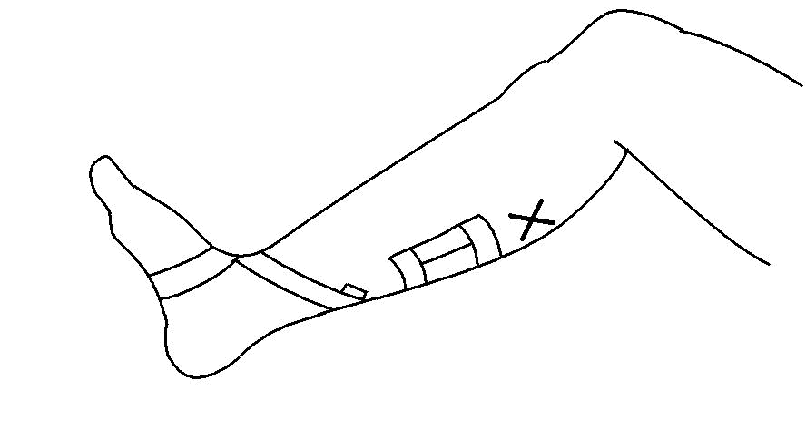 このテーピングは、まず過伸長部分を伸びないように固定してから、次に足関節を底屈しないように固定し、過収縮部分が縮まないようにしている。